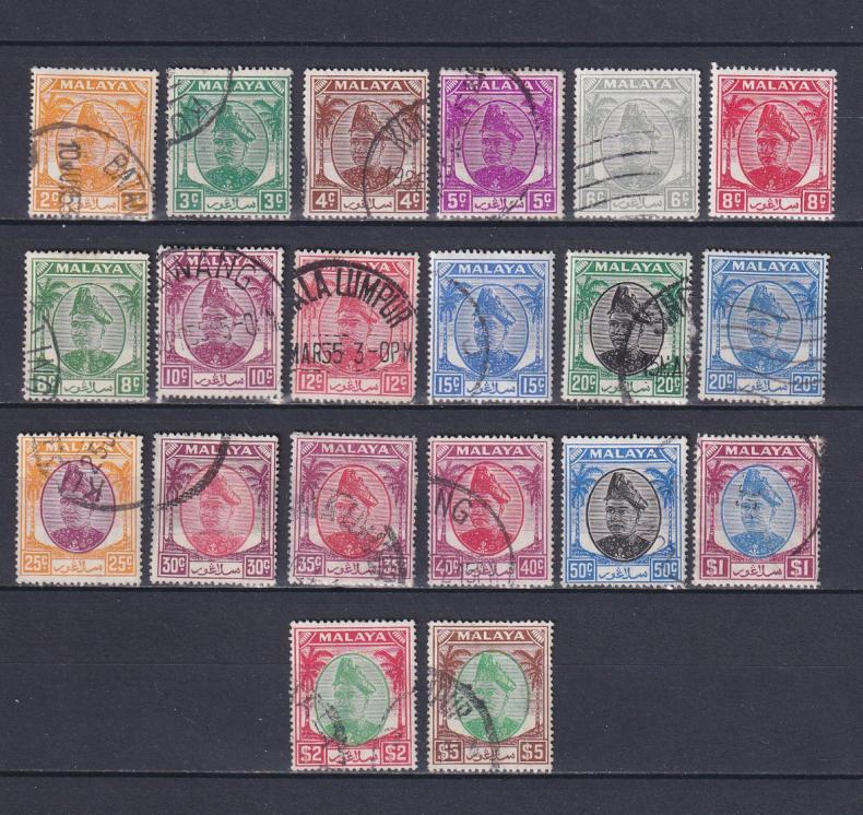 1949 - 1955 г.г.СелангорНе хватает первой марки из серии.12c - грибок$1 - изломы бумагиСостояние: гашеныеКлей: с наклейкойДефекты: залом, грибокGibbons: № 90-110 (●) 26 £