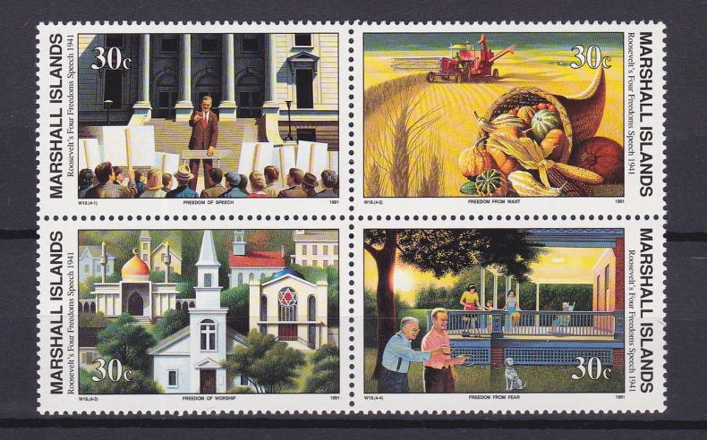 1991 г.Маршалловы островаИстория Второй Мировой войны: Четыре свободы Франклина РузвельтаСостояние: чистыеКлей: без наклейкиMichel: Кв.блок. 338-341