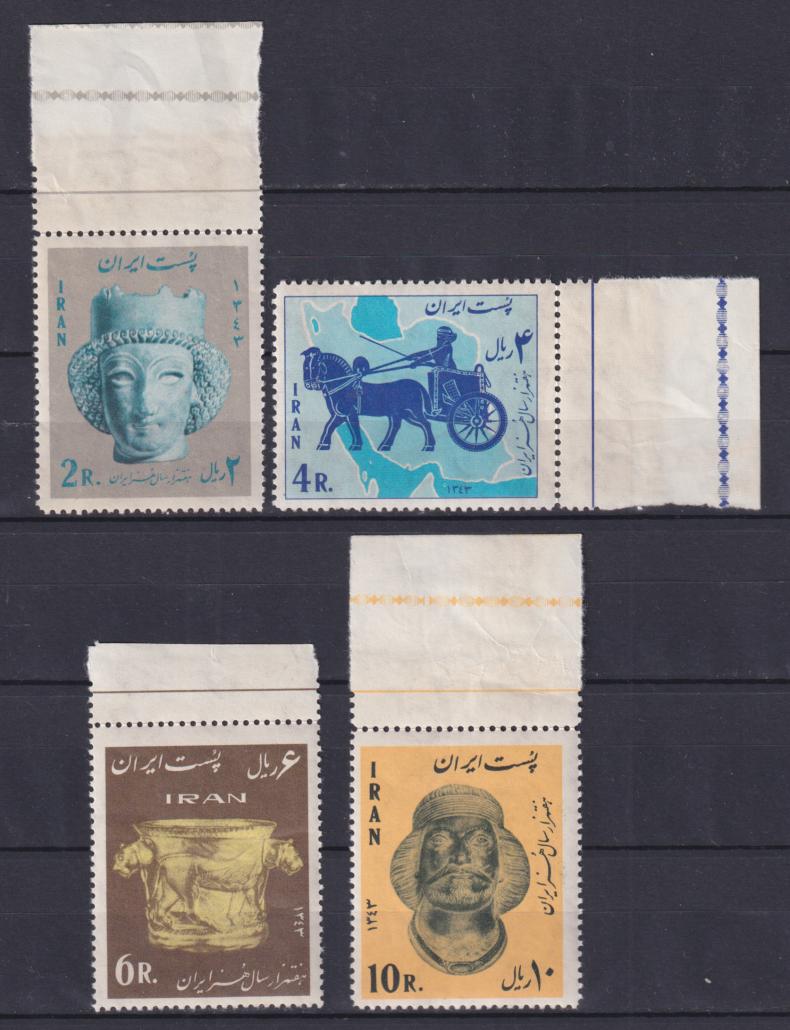 1964 г.ИранУ первой марки деформирован клей.Смотрите изображение.Поля согнуты по перфорации.Состояние: чистыеКлей: без наклейкиMichel: № 1215-1218 ** 25 €