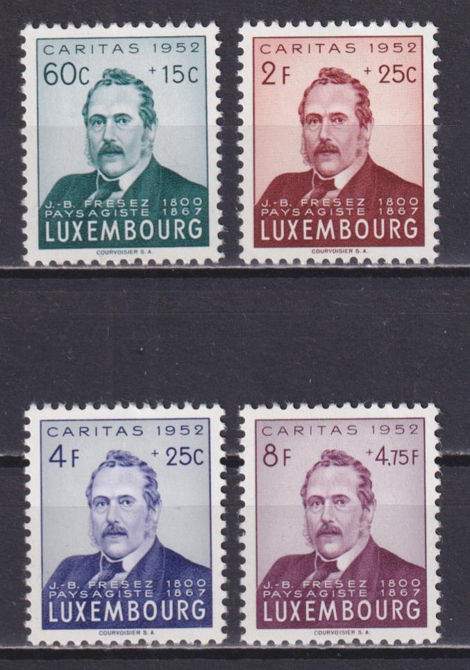 1952 г.ЛюксембургУ марки номиналом 2F+25с чёрная точка на оборотной стороне.Состояние: чистыеКлей: след от наклейкиMichel: № 501-504 * 25 €