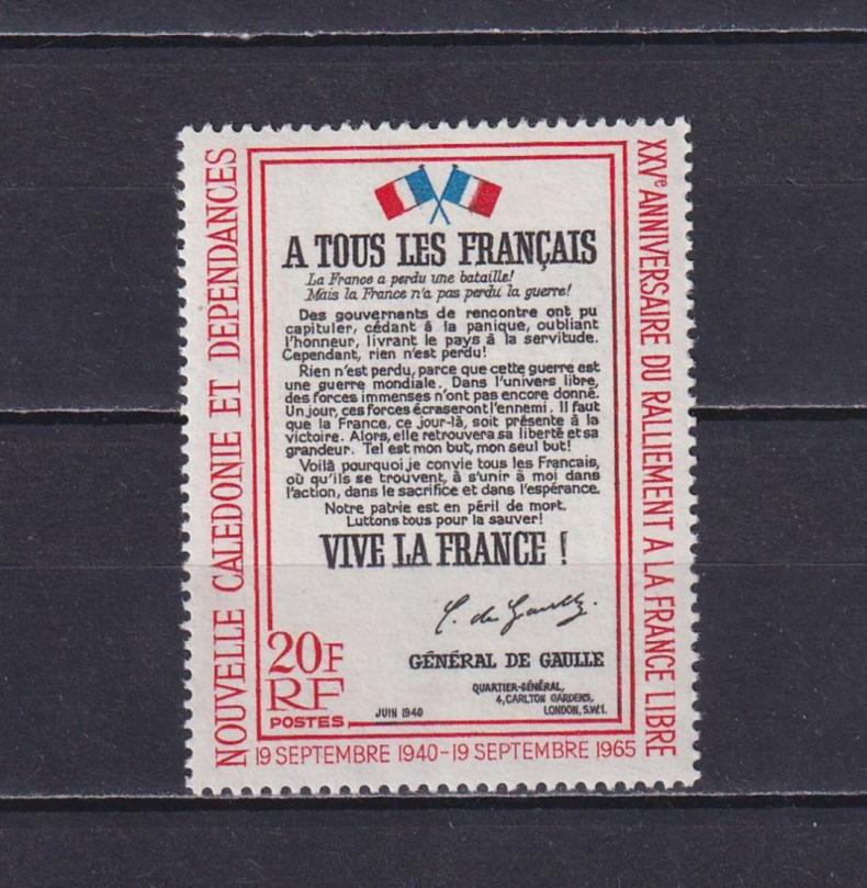 1965 г.Новая Каледония25-я годовщина присоединения Новой Каледонии к Свободной ФранцииСостояние: чистыеКлей: след от наклейкиMichel: № 413