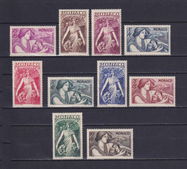 1941 г.МонакоКлей поврежденУ марки номиналом 1F+1F тонкое местоСостояние: чистыеКлей: без наклейкиДефекты: тонкое местоMichel: № 247-256 ** 90 €
